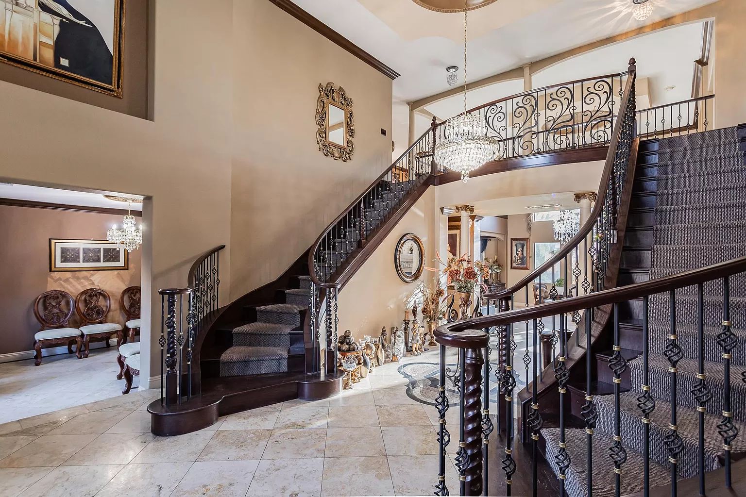 This mansion has a 3 car garage, 21' ceilings grand entry with double staircase leading to the huge loft. A large balcony overlooking the custom tropical pool & spa, covered patio, built in BBQ station and private backyard.